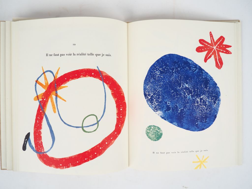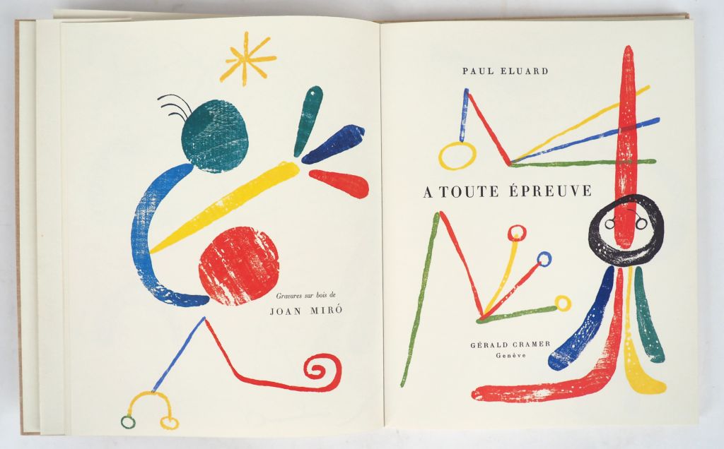 ÉLUARD (P.). À TOUTE ÉPREUVE. Genève, G. Cramer, 1984. Grand in-4 broché + fascicule broché de 22 pp. FAC-SIMILÉ DE L’ÉDITION ILLUSTRÉE par JOAN MIRÓ parue en 1958 et dont le tirage était limité à 130 exemplaires. 80 GRAVURES sur bois originales en noir et en couleurs de JOAN MIRÓ. Le fac-similé porte le n°75. Bien complet du fascicule.