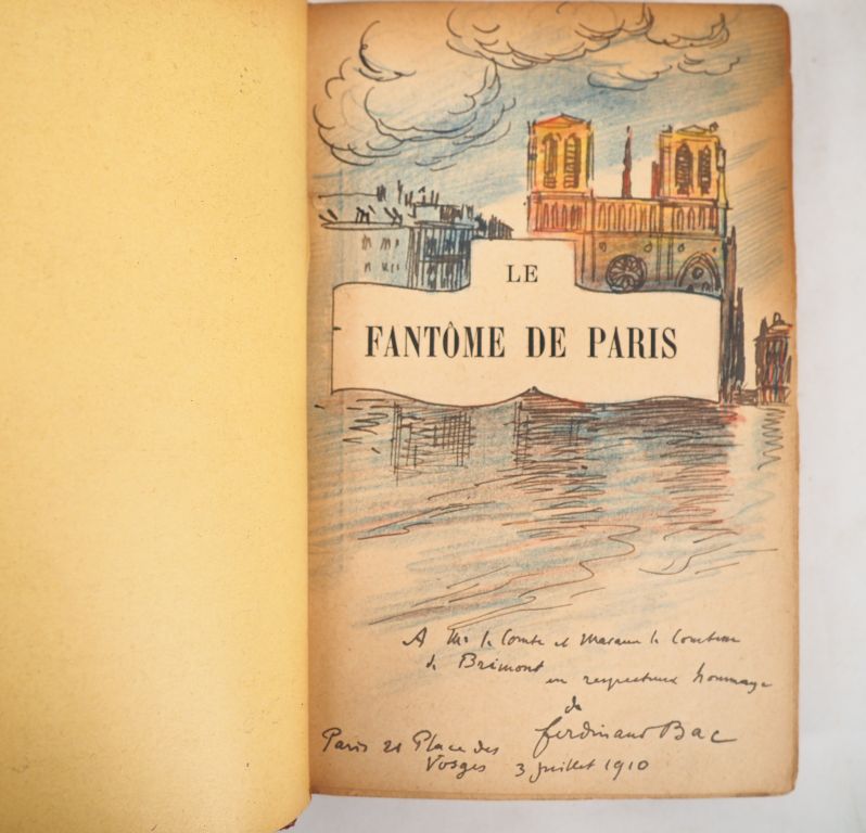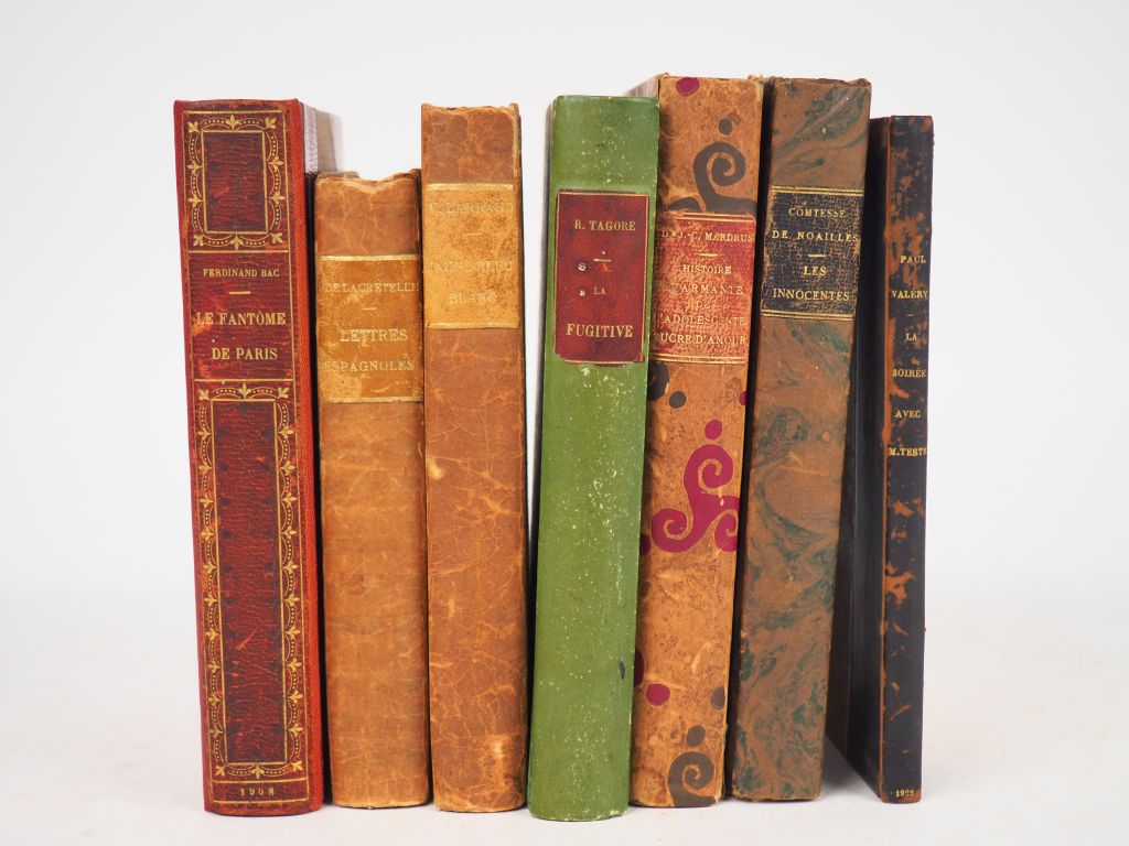 [ENVOIS AUTOGRAPHES]. ENSEMBLE DE 7 OUVRAGES dédicacés à l’écrivaine française Renée de BEAUMONT, baronne de BRIMONT (1880-1943). - BAC (F.). LE FANTÔME DE PARIS. P., Charpentier, 1908. In-12 ½ maroquin grenat à coins (Stroobants). Reliure défraîchie. É.O. E.A.S. de l’auteur à la baronne de Brimont enrichi d’un DESSIN ORIGINAL couleurs représentant Notre-Dame de Paris. - LACRETELLE (J. de). LETTRES ESPAGNOLES. P., Éd. de la Nrf, 1927. In-12 reliure papier (défraîchie). Exemplaire du Service de Presse. É.O. L.A.S. de l’auteur adressée à la baronne de Brimont. - LARBAUD (V). JAUNE BLEU BLANC. P., Éd. de la Nrf, 1927. In-12 reliure papier (défraîchie). Exemplaire du Service de Presse. E.A.S. de l’auteur à la baronne de Brimont. - MARDRUS (Dr. J.-C.). HISTOIRE CHARMANTE DE L’ADOLESCENTE SUCRE D’AMOUR. P., Fasquelle, 1927. In-12 reliure papier (défraîchie). Exemplaire du Service de Presse. E.A.S. de l’auteur à la baronne de Brimont. - NOAILLES (Comtesse Anna de). LES INNOCENTES ou La sagesse des femmes. P., Fayard, [sans date]. In-12 reliure papier. E.A.S. de l’auteur à la baronne de Brimont. - TAGORE (R.). LA FUGITIVE. P., Éd. de la Nrf, 1922. In-12 reliure Bradel papier (M. Hugon). É.O. de la traduction par Renée de Brimont. UN des 10 h.-c. numérotés sur vélin pur fil. MANUSCRIT en anglais d’une page, montée sur onglet. - VALÉRY (Paul). LA SOIRÉE AVEC M. TESTE. P., Éd. de la Nrf, 1922. In-12 ½ basane brune (frottée). UN des 25 exemplaires h.-c. numérotés sur vergé d’Arches. E.A.S. de l’auteur à la baronne de Brimont. Montée en tête sur onglet une L.A.S. adressée à la même.