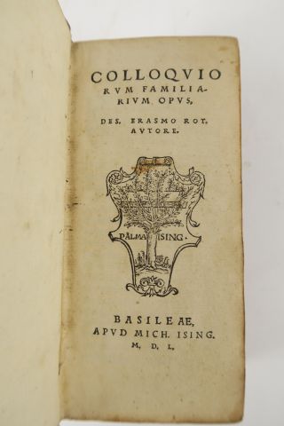 ERASME. Colloquiorum familiarum opus. Bâle, Mich. Ising 1550. in-12 allongé, 2ff.-835(1)pp.-12 ff.n.ch. Veau glacé, encadr. à la Du Seuil à froid, avec fleur. d'angle et du centre dor., dos à 6 nerfs, pt fleur. dor. (Rel. d'époque). Coiffes arrachées, fente sur la moitié d'un mors.