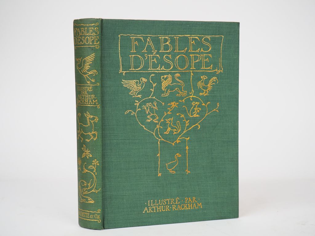 ÉSOPE. FABLES. P., Hachette, 1913. In-8 percaline verte illustrée de l’éditeur. TRADUCTION NOUVELLE ILLUSTRÉE par Arthur RACKHAM de 13 PLANCHES h.-t. couleurs sous serpente légendée et de dessins en noir dans le texte.