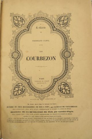 FABRE (Fabre). Les Courbezon. Paris, Publication littéraire du Siècle s.d. (1861 ?). in-4. 1/2 maroquin tête de nègre, caissons dor., tête dor., couv. cons. (Rel. d'époque). Premier roman de de Ferdinand Fabre, parfois surnommé "le Balzac des curés". Bel exemplaire, finement relié.