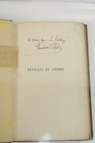 FABRE (Ferdinand). Feuilles de lierre. Paris, Charpentier 1853. in-12. 1/2 maroquin olive à coins, roulettes et fil. dor., guirlande de feuilles de lierre mosaïquée, tête dor., couv. et dos cons. (Rel. postérieure). Edition Originale. Envoi a.s. Recueil de poésies et premier livre de Ferdinand Fabre. Vicaire cite un premier recueil paru confidentiellement à Montpellier en 1848.