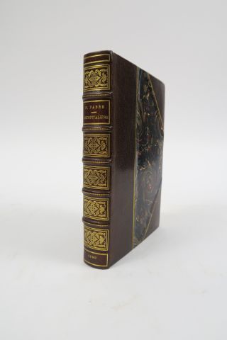 FABRE (Ferdinand). L'Hospitalière. Drame rustique en cinq journées. Paris, Charpentier 1880. in-12. 1/2 maroquin à coins, caissons ornés de fleur. azurés, tête dor., couv. cons. (Granghaud). Edition originale. Bel exemplaire sur papier Hollande (non justifié).