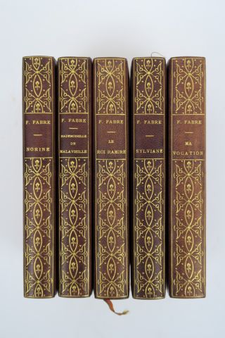 FABRE (Ferdinand). Mademoiselle de Malavieille. – Le Roi Ramire. – Sylviane. Illustrations de Georges ROUX. – Ma vocation. Paris, Charpentier 1888, 1889, 1899, 1892, 1908. 5 vol. in-12. Reliure uniforme, dos lisse orné de larges fleur. stylisés. – Norine. Paris, Charpentier 1889. in-12. 1/2 chagr. havane, dos lisse orné d'un beau décor dor., tête dor., couv. cons. Ensemble 2 vol.