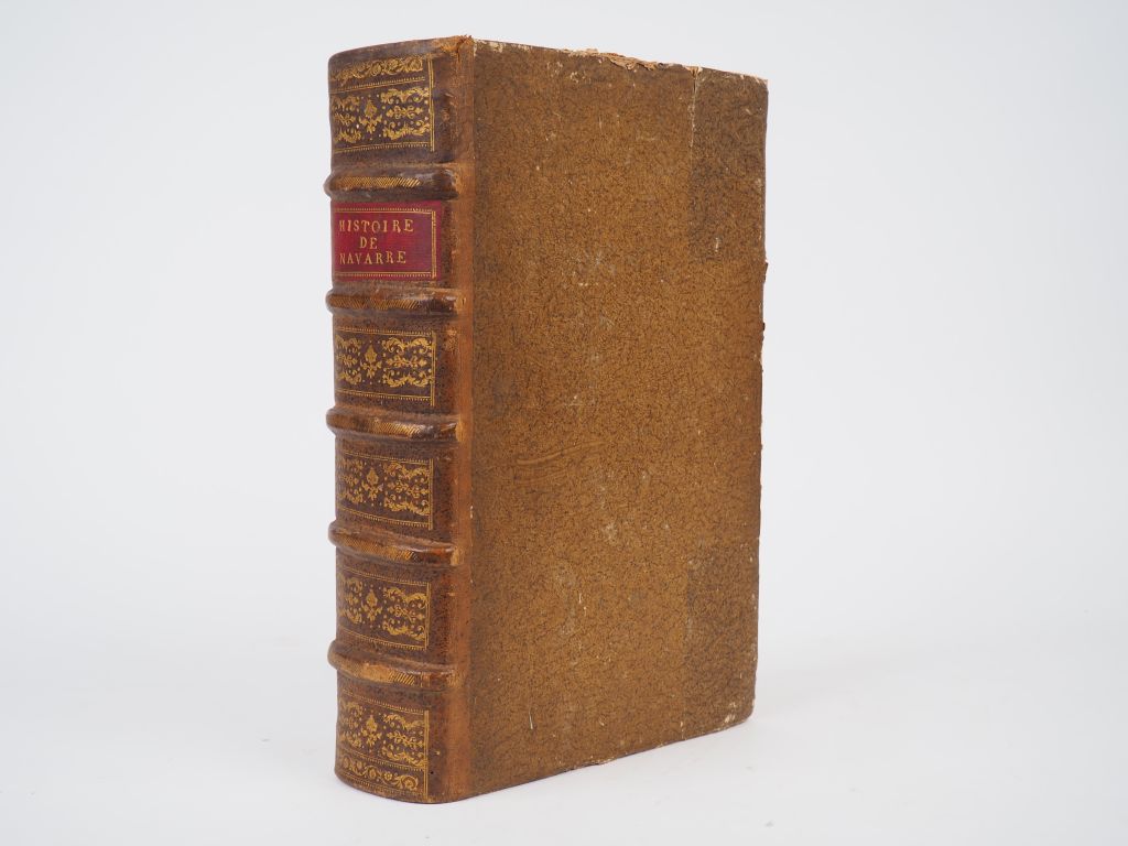 FAVYN (André). Histoire de Navarre contenant l'origine, les vies et conquestes de ses Roys depuis leur commencement jusques à présent. Paris, Laurent Sonrius, Pierre Mettayer, Pierre Chevallier 1612. in-folio. Titre front. -2 ff.-1340 pp + table. 1/2 veau, caissons et fleur. dor., pce de titre rouge (Rel. de l'époque). Titre-frontispice allégorique gravé par Léon Gaultier. Edition originale. Qqs piqures éparses.