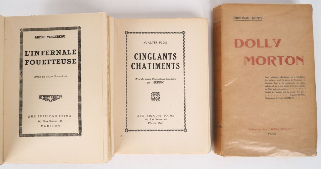 [FLAGELLATION]. VERGEREAU (A.). L’INFERNALE FOUETTEUSE. P., Éditions Prima, [années 1930]. In-8 broché. ÉDITION ORIGINALE ILLUSTRÉE : couverture et 12 compositions h.-t. de HERRIC, pseudonyme de Chéri HÉROUARD (1881-1961) – FLOG (W.). CINGLANTS CHÂTIMENTS. P., Éditions Prima, [années 1930]. In-8 broché. ÉDITION ORIGINALE ILLUSTRÉE : couverture et 12 compositions h.-t. de HERRIC, pseudonyme de Chéri HÉROUARD (1881-1961) – KIPPS (D.). DOLLY MORTON. P., Collection des Orties Blanches, [1928]. In-8 broché. ÉDITION ILLUSTRÉE de 8 gravures h.-t. (dont frontispice) de Louis MALTESTE. ENSEMBLE DE 3 VOLUMES.