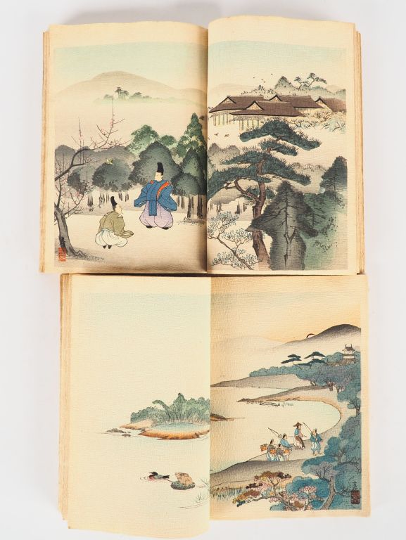 FLORIAN (J.P Claris de). Fables choisies, illustrées par des artistes japonais sous la direction de P. Barboutau, Tokio. Paris, Marpon et Flammarion s.d. (1896). 2 vol. in-8 broché à la japonaise. Edition imprimée au Japon sur papier crépon, illustrée de 28 estampes couleurs en double page par divers artistes japonais et de vignettes en noir