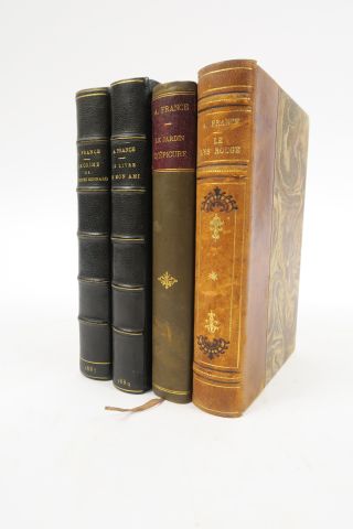 FRANCE (Anatole). Le crime de Sylvestre Bonnard. – Le livre de mon ami. Paris, Calmann Levy 1887-1889. 2 vol. 1/2 chagr. noir, fil. dor. aux nerfs (Rel. d'époque). Joints : – Le Jardin d'Epicure. Calmann Levy 1895. Bradel 1/2 percaline olive. – Le Lys rouge. Paris, Calmann Levy 1925. 1/2 basane ornée (Rel. d'époque). Ensemble 4 vol. in-12.