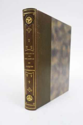 FRANCE (Anatole). Les Contes de Jacques Tournebroche. Illustrations de Léon LEBÈGUE. Paris, Calmann Levy 1908. pt in-4 gdes marges. 1/2 maroquin olive, dos lisse orné de fil. en encadr., de rosaces et ptes hermines dor., tête dor., couv. et dos (Rel. d'époque). Illustrations en couleurs rehaussées d'or dans le style des enluminures médiévales, dans le texte et hors-texte. Portrait à l'eau-forte. Bel exemplaire.