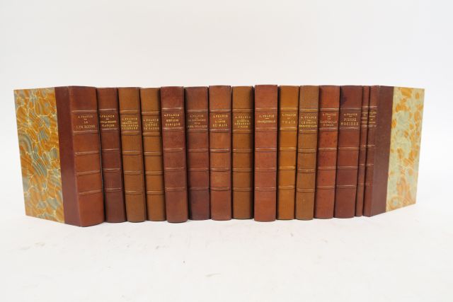 FRANCE (Anatole). Pierre Nozière. Paris, Lemerre 1899. Ed. Originale. Joint : – Le Mannequin d'osier. – Crainquebille, Putois, Riquet et autres récits profitables. – L'Etui de nacre. – Histoire comique. – Le puits de Sainte Claire. – La Rôtisserie de la reine Pédauque. – Thaïs. – L'Orme du Mail. – Monsieur Bergeret à Paris. – Sur la pierre blanche. – Le lys rouge. – Discours de réception de Anatole France, 24 décembre 1896. – Discours prononcé à l'inauguration de la statue d'Ernest Renan. 14 septembre 1903. Paris, Calmann Levy 1897 et s.d. 14 vol. in-12 en reliure uniforme 1/2 chagr. janséniste havane, tête dor., couv. (Rel. d'époque).