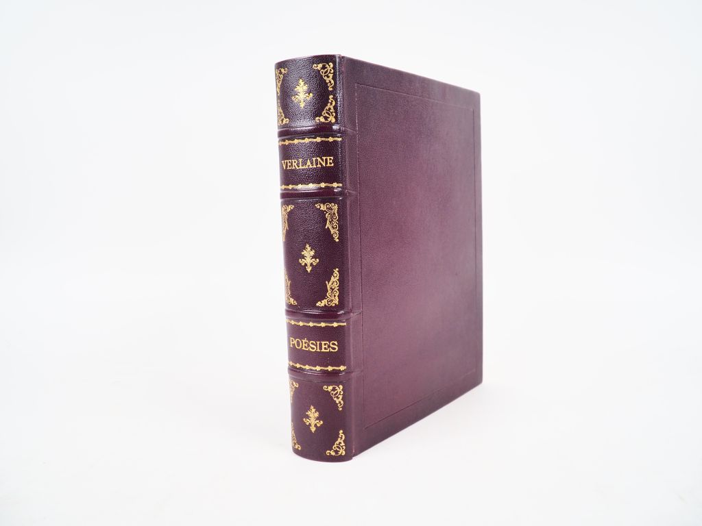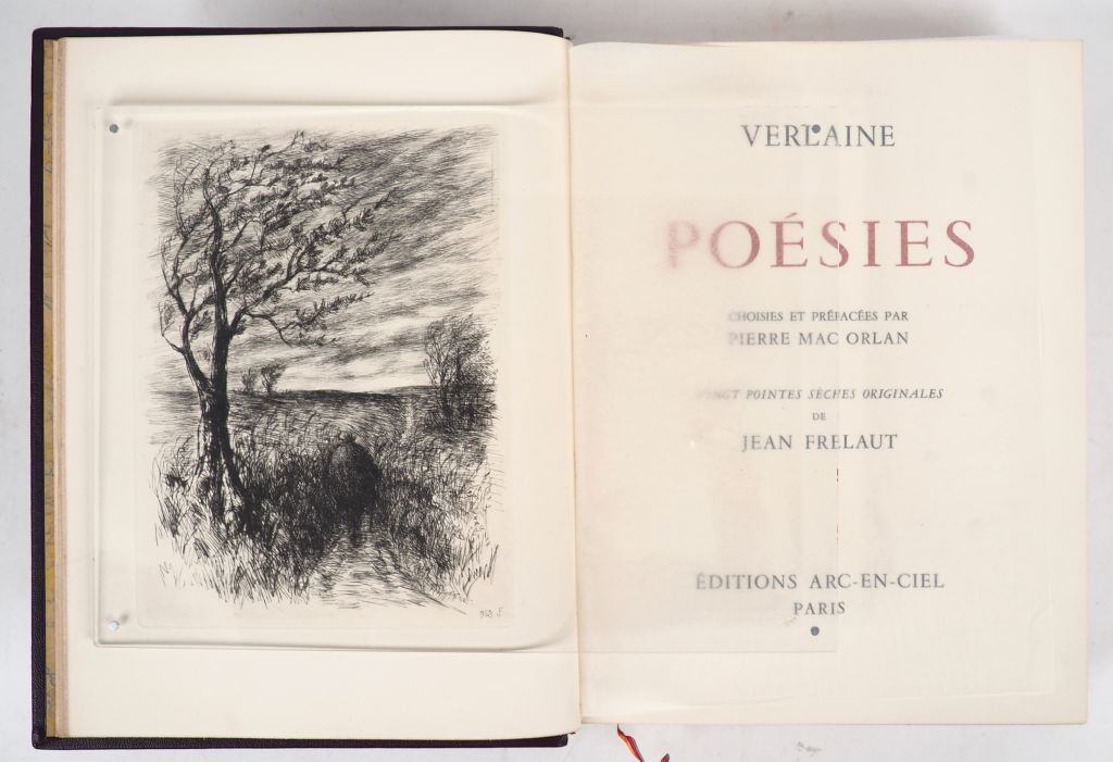 [FRÉLAUT]. VERLAINE (P.). POÉSIES choisies et préfacées par Pierre Mac Orlan. P., Éditions Arc-en-ciel, 1953. Grand in-4 chagrin marron foncé, encadrement de filet à froid sur les plats, dos à nerfs orné de fleurons dorés, titre doré, 1er plat de la couverture conservé (Reliure de l’époque). ÉDITION ILLUSTRÉE de 20 POINTES-SÈCHES originales à pleine page en noir de Jean FRÉLAUT. Tirage limité à 250 exemplaires. UN des 175 numérotés sur Grand Vélin pur fil des Papeteries du Marais.