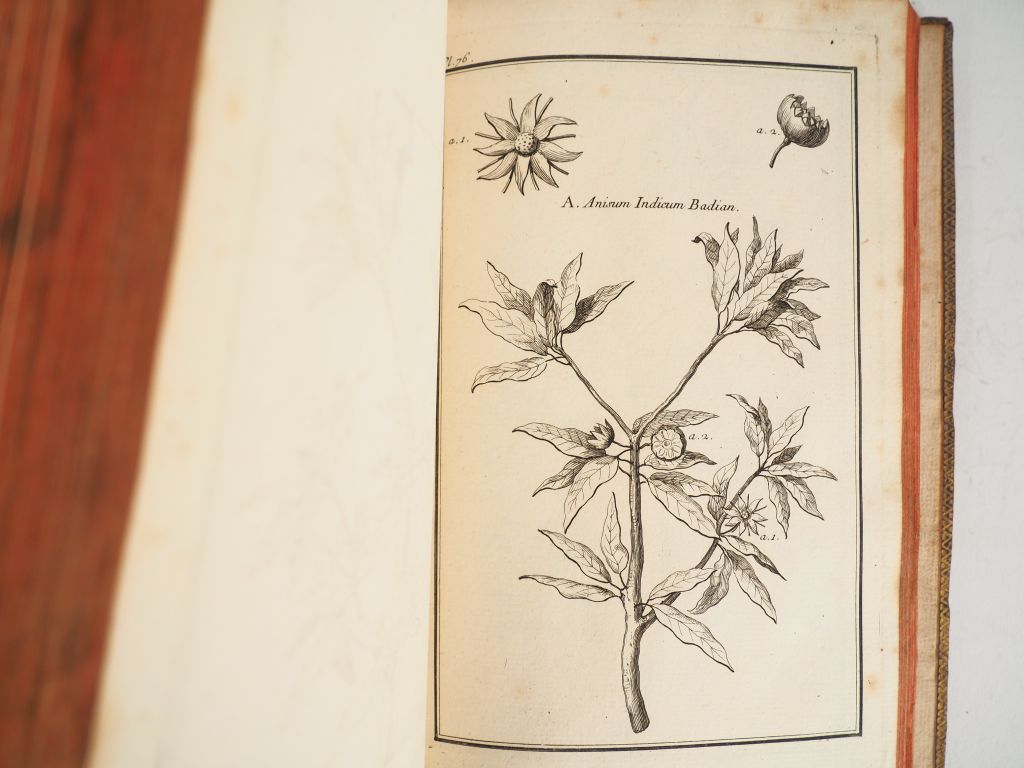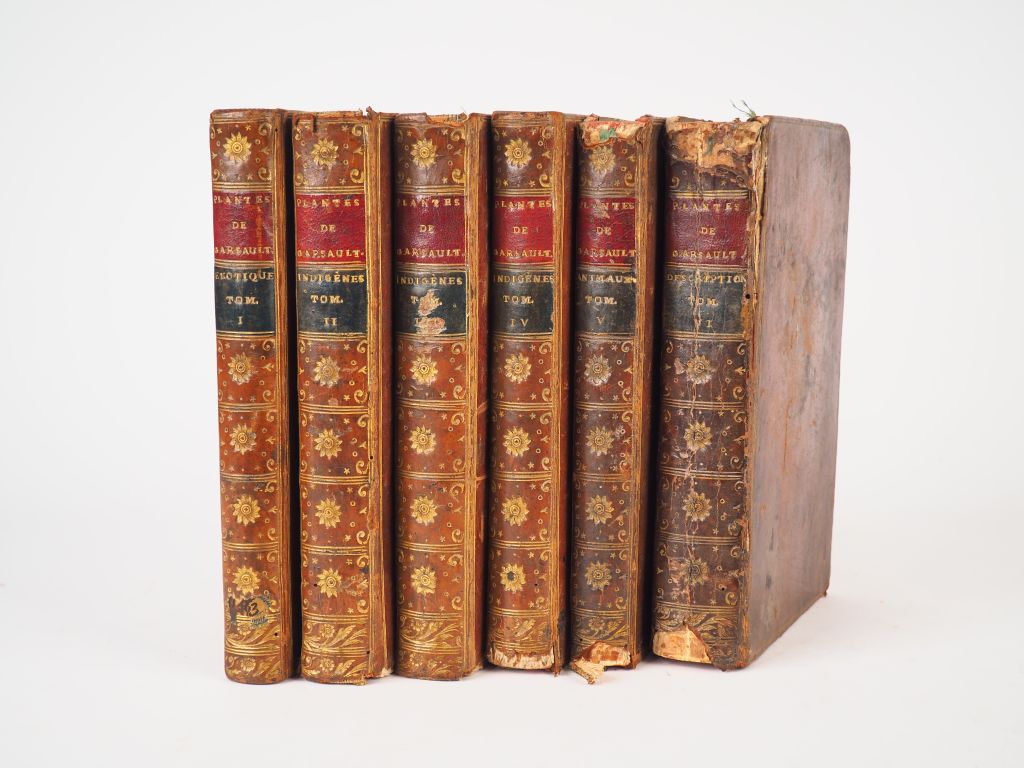 GARSAULT (M. de). Description et usages de sept cents dix-neuf plantes tant étrangères que de nos climats et de cent trente quatre animaux, gravées en taille douce par MM. De Fehrt, Prévost, Duflos, Martinet, et rangées suivant l'ordre du livre intitulé Matière médicale de M. Geoffroy. Paris, Didot le jeune 1767. 6 vol. in-8. Veau brun, fil. d'encadr. dos lisse orné. Usures aux coiffes et aux coins , travail de vers en marge du volume de texte. Un volume de texte donnant l'explication des planches qui manque souvent. 5 volumes de planches contenant 729 planches toutes gravées par Garsault. Collection complète, rare (Brunet II, 1496).