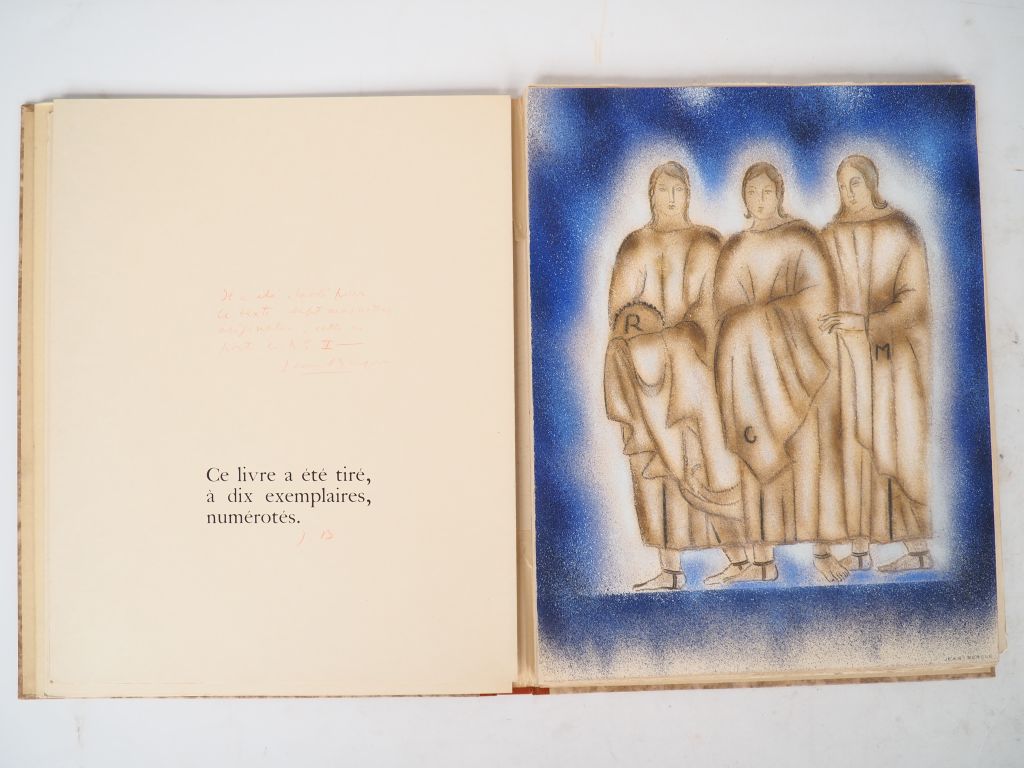 GOETHE. PROLOGUE DANS LE CIEL (Faust). Traduction de Gérard de Nerval. P., Gonin, Aux Dépens de Jean Berque, 1932. Grand in-4 en ff., couverture muette rempliée, chemise et étui de l’éditeur. Petits défauts à la chemise et à l’étui. ÉDITION ILLUSTRÉE de 15 COMPOSITIONS en couleurs à la gouache de Jean BERQUE (1896-1954), toutes signées par l’artiste : frontispice, 8 illustrations à pleine page, 2 illustrations dans le texte, 3 bandeaux et 1 cul-de-lampe. Il y a également 3 superbes lettrines en couleurs non signées. Tirage limité à 10 EXEMPLAIRES. Celui-ci imprimé sur papier Japon porte, au-dessus de l’annonce imprimée du tirage, une mention manuscrite signée au crayon rouge : « Il a été établi pour ce texte sept maquettes originales, celle-ci porte le n°V – Jean Berque ». BEL EXEMPLAIRE, en PARFAIT ÉTAT. ¶ Monod, 5531, qui annonce 15 compositions en couleurs.