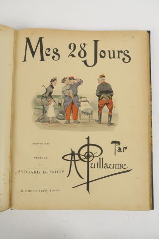 GUILLAUME (Albert). Mes Campagnes. Album militaire inédit. Préface de Georges Courteline. – Mes 28 jours. Préface par Edouard Detaille. – Mon Sursis. Album militaire. Préface de Richard O'Monroy. Paris, Simonis Empis 1896, 1898, 1901. 3 albums reliés en 1 vol. in-4. 1/2 percaline verte à coins (Rel. d'époque). Albums en couleurs.