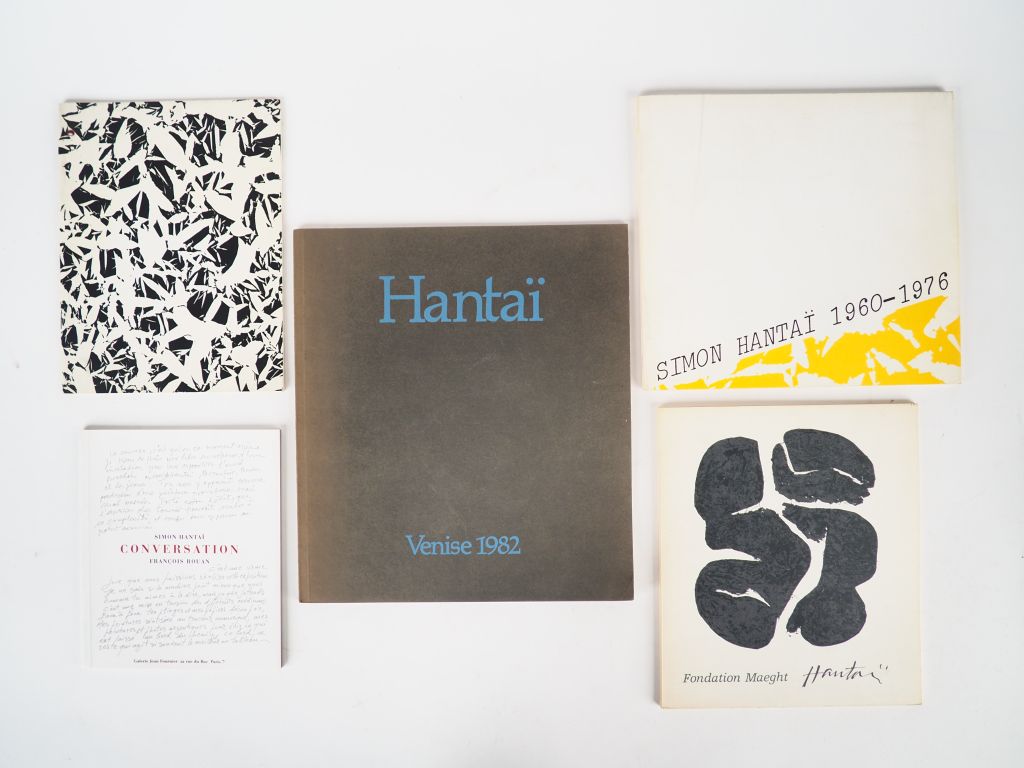 HANTAÏ (Simon). HANTAÏ. Biennale de Venise, 1982. Textes : Dominique Bozo et Yves Michaud. Reproductions noir et couleurs. - [Hantaï]. PLEYNET (Marcellin). Identité de la lumière. Marseille. ARCA 1983. Reproductions noir et couleur in-8, br. - HANTAI. Saint-Paul, Fondation Maeght dec. 1968 - mars 1969. Reproductions noir et couleurs in-4, br. - HANTAI 1960-1976. Bordeaux, CAPC, 1981. in-4 oblong 74 pp. Textes : Marcellin, Pleynet, Jean-Marc Poinsot. Chronologie et bibliographie. Reproductions noir et couleur. - Simon HANTAÏ-François ROUAN Conversation. Galerie Fournier 2005. in-12, carre, br. Texte : Hubert Damisch. Reproductions noir et couleur. Ensemble de 5 catalogues d'exposition