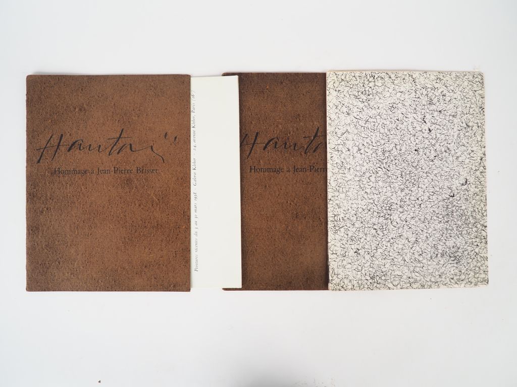 HANTAÏ (Simon). Sexe-Prime. Hommage à Jean-Pierre Brisset et autres peintures. Paris, Galerie Kléber mai-juin 1956. 2 cahiers 24 x 32 cm (8pp) + 2pp : texte d'Hantaï. Sous chemise cartonnée. Joint : - HANTAÏ. Peintures récentes. Souvenir de l'Avenir. Paris, Galerie Kléber, mars 1958. 1 fol. 62 x 98 cm (16 pp), imprimé recto-verso. Texte manifeste "Notes confusionnelles accélérantes et autres pour une avant-garde réactionnaire non réductible "imprimé en rouge. Reproduction en noir au verso des Notes préparatoires pour les cérémonies commémoratives de la condamnation de Siger de Brabant… ". Chemise cartonnée