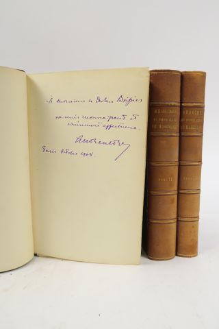 HOHENLOHE (Prince Clovis de). Mémoires. Un siècle de politique allemande. I. L'Unité allemande. II. La Guerre de 1870. III. L'Ambassade à Paris. Le Gouvernement d'Alsace-Lorraine. Hohenlohe chancelier de l'Empire. Paris, Louis Conard 1909. 3 vol. in-8. 1/2 chagrin janséniste brun, tête dor., couv. et dos (Rel. d'époque). Exemplaire enrichi d'un envoi a.s. et de 2 lettres a.s. [25 oct. 1908, 20 août 1910, 4 pp. in-12 et 4 pp. in-8] adressées au Dr François Boissier. Dos passés aux tomes II et III.