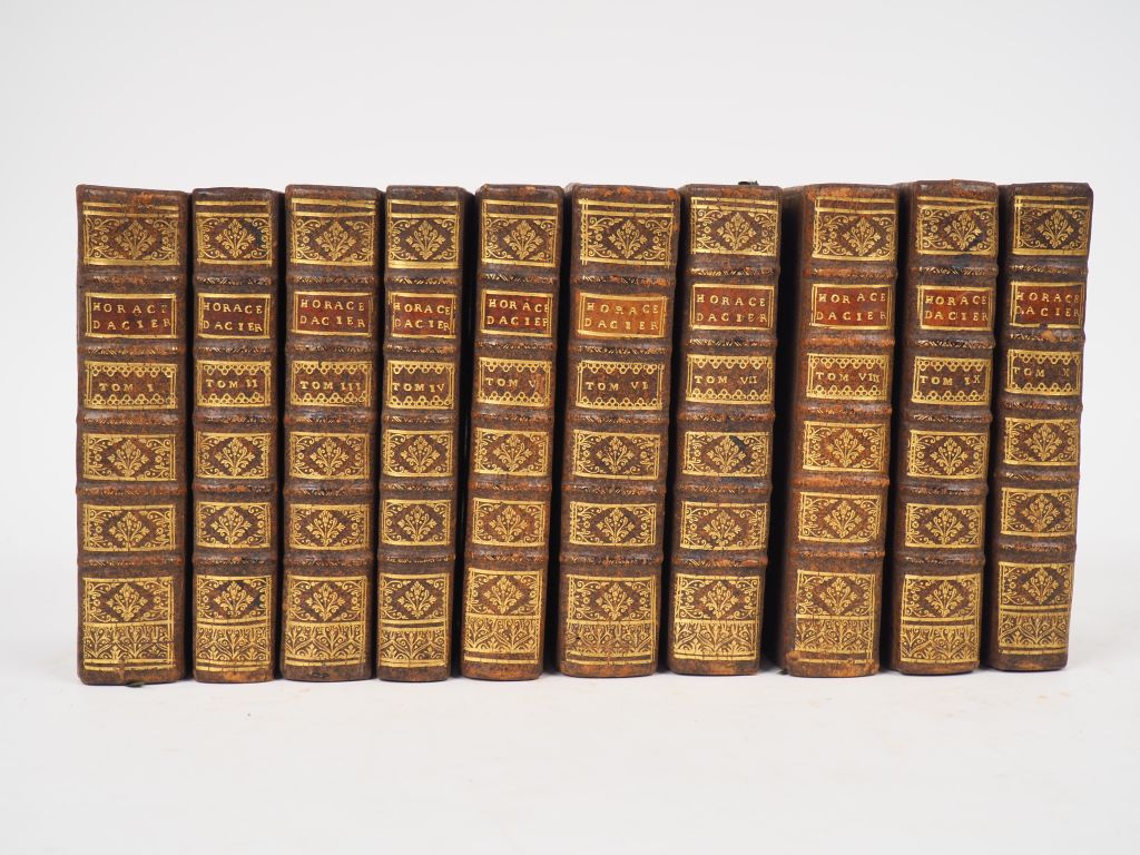 HORACE. ŒUVRES. P., Ballard, 1709. Dix volumes in-12 veau brun, dos à nerfs orné, pièce de titre maroquin grenat, tranches rouges (Reliure de l’époque). TROISIÈME ÉDITION avec des remarques critiques et historiques par Dacier, revue, corrigée et augmentée. Un FRONTISPICE gravé par B. Picart. Ex-libris héraldique « Duguet ». BEL EXEMPLAIRE, frais.