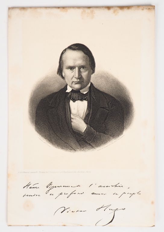 HUGO (V.). TREIZE DISCOURS. P., Librairie Nouvelle, 1851. In-8 broché. Rousseurs éparses, plus marquées au titre. Exemplaire en grande partie non coupé. ÉDITION EN PARTIE ORIGINALE de l’ensemble des FAMEUSES ŒUVRES ORATOIRES de l’écrivain. La première intitulée Douze Discours a été publiée la même année que celle-ci. JOINTS à l’exemplaire : un BEAU PORTRAIT de l’écrivain sur Chine collé dessiné et gravé par A. Masson avec la reproduction en fac-similé de sa fameuse formule « Haine vigoureuse de l’anarchie / tendre et profond amour du peuple » et un GRAND FEUILLET libre imprimé contenant la Liste des onze représentant du peuple pour le Département de la Seine proclamés aujourd’hui à l’Hôtel de ville, sur laquelle figurent notamment les noms de V. Hugo, Thiers, Proudhon et Louis Bonaparte ainsi que sur un petit feuillet imprimé les Candidats à l’Assemblée Nationale-Liste du Comité électoral de la Seine. RARE ENSEMBLE.
