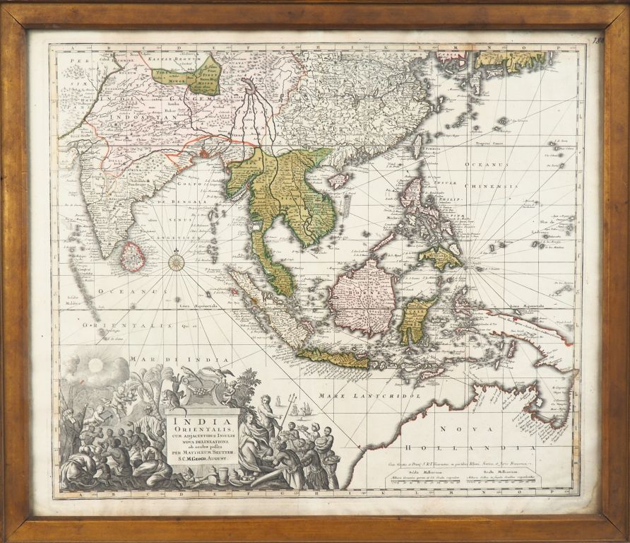 [INDE]. SEUTTER (M.). INDIA ORIENTALIS, cum adjacentibus Insulis nova delineatione, ob oculos posita. [Augsbourg, c. 1730]. Carte (56,5 X 48 cm environ) sous verre, cadre bois. BELLE CARTE GRAVÉE ET AQUARELLÉE DE L’ASIE DU SUD-EST ET PARTIE NORD-OUEST DE L’AUSTRALIE avec un important cartouche.