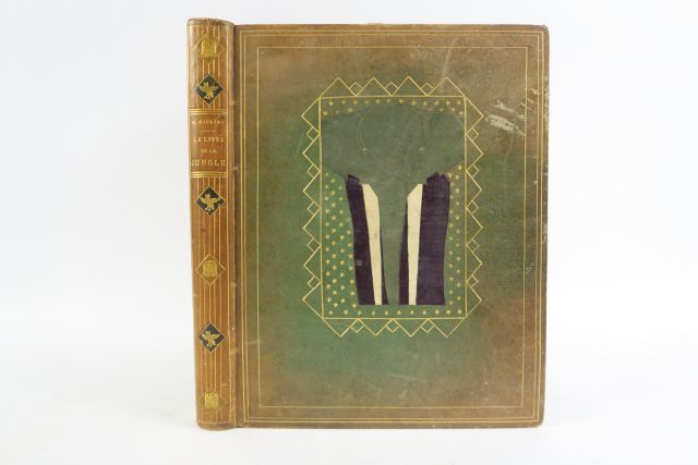 KIPLING (Rudyard). Le Livre de la Jungle. Illustrations de Roger Reboussin. Paris, librairie Delagrave s. d. (1934). Veau vert, dos lisse orné de fil. dor. en long et de fleur. de chouettes, et d'aigles dor., décor doré et mosaïqué au plat sup., roulette int. d'encadr., tête dor., couv. (Rel. d'époque). Illustrations en noir. Dos et bord des plats brunis.