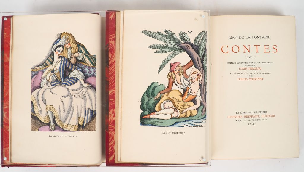 LA FONTAINE (J.). CONTES. P., G. Briffaut, 1928. Deux volumes grand in-8 ½ chagrin rouge à coins, dos à nerfs, titre doré, tête dorée, plats de la couverture conservés (Reliure de l’époque). ÉDITION ILLUSTRÉE de 56 COMPOSITIONS en couleurs (14 h.-t. et 42 dans le texte) par GERDA WEGENER. Tirage limité à 1000 exemplaires. UN des 959 numérotés sur vélin de Rives.