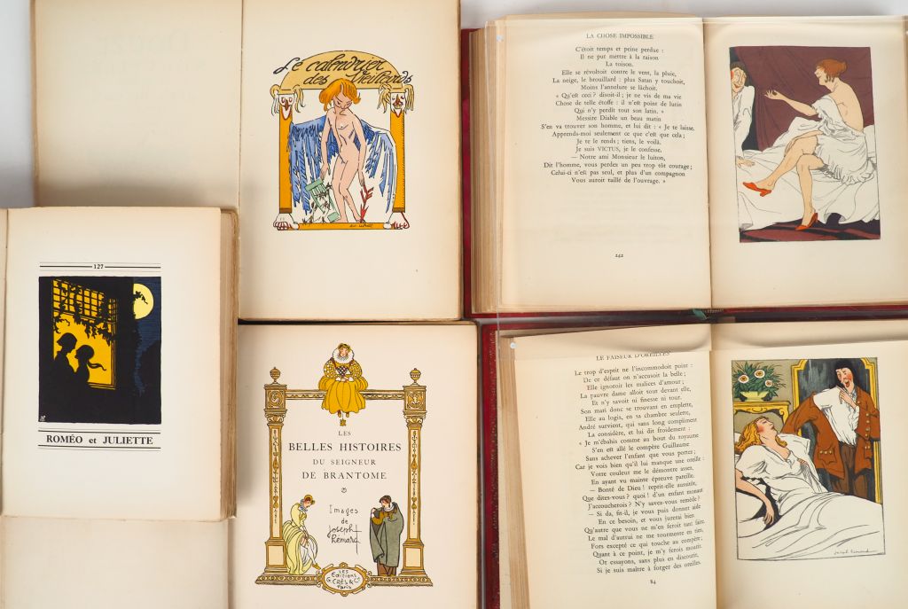 LA FONTAINE (J. de). CONTES. P., Éditions du Trianon, 1930. Deux volumes in-8 ½ chagrin rouge à coins, dos à nerfs filetés or, titre doré, tête dorée, couverture conservée (Reliure de l’époque). ÉDITION ILLUSTRÉE de COMPOSITIONS à pleine page coloriées au pochoir de Joseph HÉMARD. Tirage non numéroté sur vélin de fil du Marais. Exemplaire enrichi de 13 DESSINS ÉROTIQUES ORIGINAUX à la mine de plomb et crayon de couleurs, non signés mais de belle facture – HÉMARD (Joseph). GALERIE DES BELLES AMOURS. P., Kieffer, 1935. Petit in-4 broché. ÉDITION ILLUSTRÉE de nombreuses COMPOSITIONS coloriées au pochoir de Joseph HÉMARD. Tirage limité à 1000 exemplaires. UN des 940 numérotés sur vélin à la cuve – BOCCACE. DOUZE NOUVELLES. P., Kieffer, 1925. In-8 broché. ÉDITION ILLUSTRÉE de nombreuses COMPOSITIONS coloriées au pochoir d’Alfred LE PETIT. Tirage limité à 550 exemplaires. UN des 500 numérotés sur vélin de cuve – LES BELLES HISTOIRES DU SEIGNEUR DE BRANTOME. P., Crès, 1924. In-4 ½ maroquin havane, dos lisse, titre à froid, titre doré (Reliure de l’époque). Petits frottements à la reliure. ÉDITION ILLUSTRÉE de COMPOSITIONS de Joseph HÉMARD : frontispice et vignette de titre couleurs, dessins en noir dans le texte. UN des 1650 exemplaires numérotés sur vélin teinté Lafuma. ENSEMBLE DE 4 OUVRAGES.