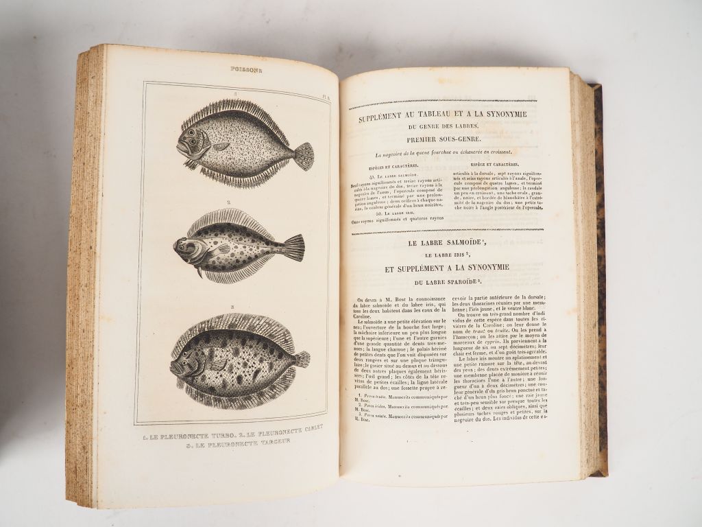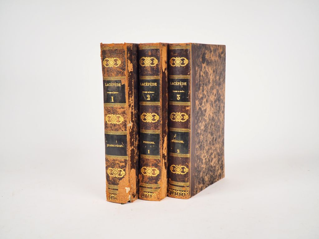 LACEPEDE (Comte de). Œuvres comprenant l'Histoire naturelle des quadrupèdes ovipares, des serpents, des poissons et des cétacés. Paris, Duméril 1826. 3 vol. in-8. Demi basane, fleur. dor. pces de titre noire (Rel. d'époque, frottée par endroit). Texte à deux colonnes, nombr. planches de figures en noir. Qq rousseurs sans gravité