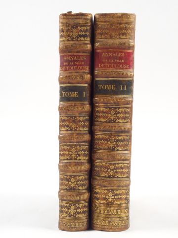 LAFAILLE (Germain de). Annales de la Ville de Toulouse depuis la réunion de la Comté de Toulouse à la Couronne, avec un abrégé de l'ancienne histoire de cette ville. Toulouse, Colomiez et Posuel 1687-1701. 2 forts volumes in-folio. Veau moucheté, dos orné, pces de titre rouges et vertes (Rel. de l'époque). Nombreux bandeaux, lettrines et culs-de-lampe gravés sur cuivre et sur bois. Source essentielle, inspirée de la méthode de CATEL, de l'histoire ancienne de Toulouse. Bel exemplaire.