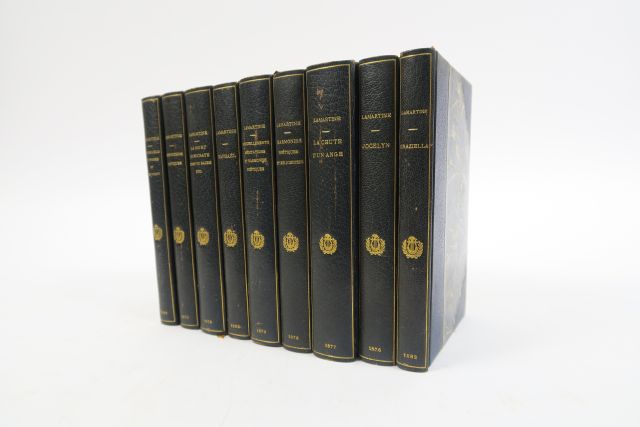 LAMARTINE. Œuvres poétiques et romans. Paris, Furne, Jouvet et Hachette 1875-1872. 9 vol. in-12. Bradel 1/2 maroquin bleu à coins, dos lisse, encadr. dor., lyre dor. au centre, couv. et dos (Champs-Stroobants). Agréable édition elzevirienne ornée de 6 frontispices. Bel exemplaire.