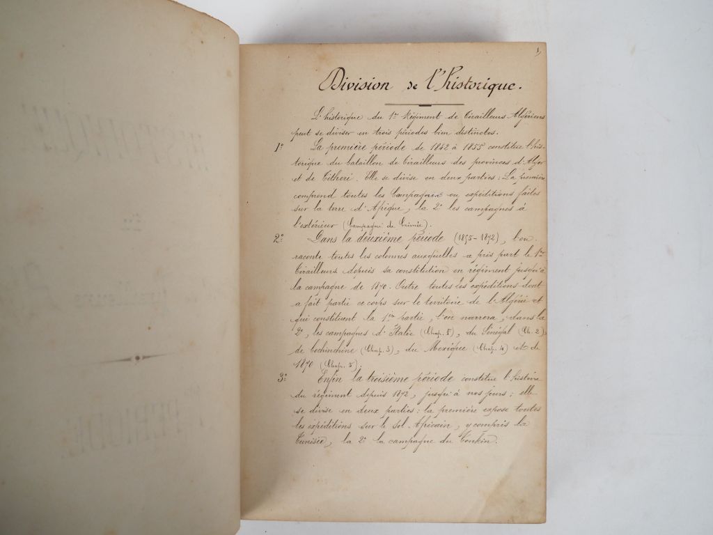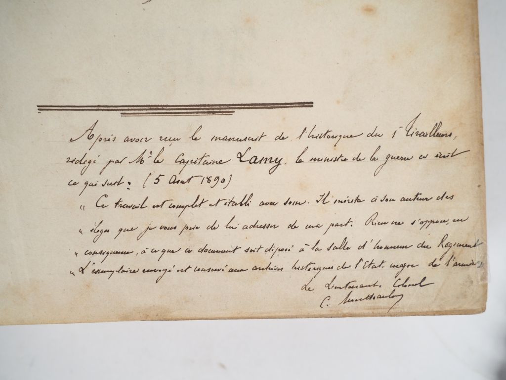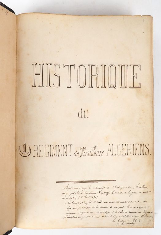 [LAMY (Capitaine François Amédée)]. HISTORIQUE DU 1er RÉGIMENT DE TIRAILLEURS ALGÉRIENS. [Vers 1890]. Petit in-folio (21 X 30 cm environ) ½ basane bleu nuit, dos lisse cloisonné de filets dorés, titre doré (Reliure fin XIXe) , (2) ff., 195 pp., (1) f. bl. – 424 pp., (1) f. bl. – 155 pp., (3) ff. de table des matières, (1) f. bl., (8) ff. d’État nominatif alphabétique. IMPORTANT MANUSCRIT en 3 parties totalisant 795 pages, rédigé à l’encre noire d’une écriture fine et parfaitement lisible. 1ère partie : période allant de 1842 à 1855 comprenant l’historique du bataillon ainsi que les campagnes et expéditions faites sur la terre d’Afrique et à l’extérieur (Campagne de Crimée) – 2ème partie : période allant de 1855 à 1872 avec en plus des campagnes d’Algérie celles d’Italie, du Sénégal, de la Cochinchine, du Mexique et guerre de 1870 – 3ème partie : période allant de 1872 à 1889 avec les campagnes sur le sol africain (dont Tunisie) et la campagne du Tonkin. Note manuscrite en pied du feuillet de titre rédigée par le lieutenant-colonel C. Monthaulon : « Après avoir reçu le manuscrit du 1er Tirailleurs rédigé par M. le Capitaine Lamy, le ministre de la guerre a écrit ce qui suit (5 août 1890) : " Ce travail est complet et établi avec soin. Il mérite à son auteur des éloges que je vous prie de lui adresser de ma part. Rien ne s’oppose en conséquence, à ce que ce document soit déposé à la salle d’honneur du Régiment. L’exemplaire envoyé est conservé aux Archives historiques de l’État-major de l’armée. Le Lieutenant-Colonel C. Monthaulon". En fin d’ouvrage on trouve une Table des matières (6 pp.) et un État nominatif alphabétique comprenant les noms des militaires de tout grade honorablement cités dans le courant du volume (15 pp.). Le commandant François Amédée LAMY (1858-1900), officier et explorateur français, est mort au combat le 22 avril 1900 lors de la bataille de Kousséri au Cameroun. Son Historique du 1er régiment de Tirailleurs Algériens semble ne jamais avoir été publié.