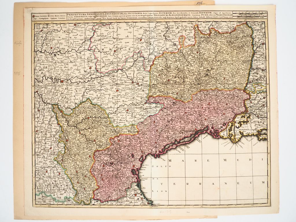 [LANGUEDOC]. PRAEFECTURA GENERALIS LANGUEDOCIAE, olim Occitania dicta [et] [MÉRIAN]. GOUVERNEMENT GÉNÉRAL DU LANGUEDOC divisé en ses Vingt-deux Diocèses. [c. 1690 – c. 1650]. Deux cartes (59 X 48,5 cm et 35,5 X 27,5 cm environ), la 1ère carte contrecollée sur carton. CARTES GRAVÉES AU XVIIe avec rehauts d’aquarelle et cartouche colorié pour la 2nde carte.