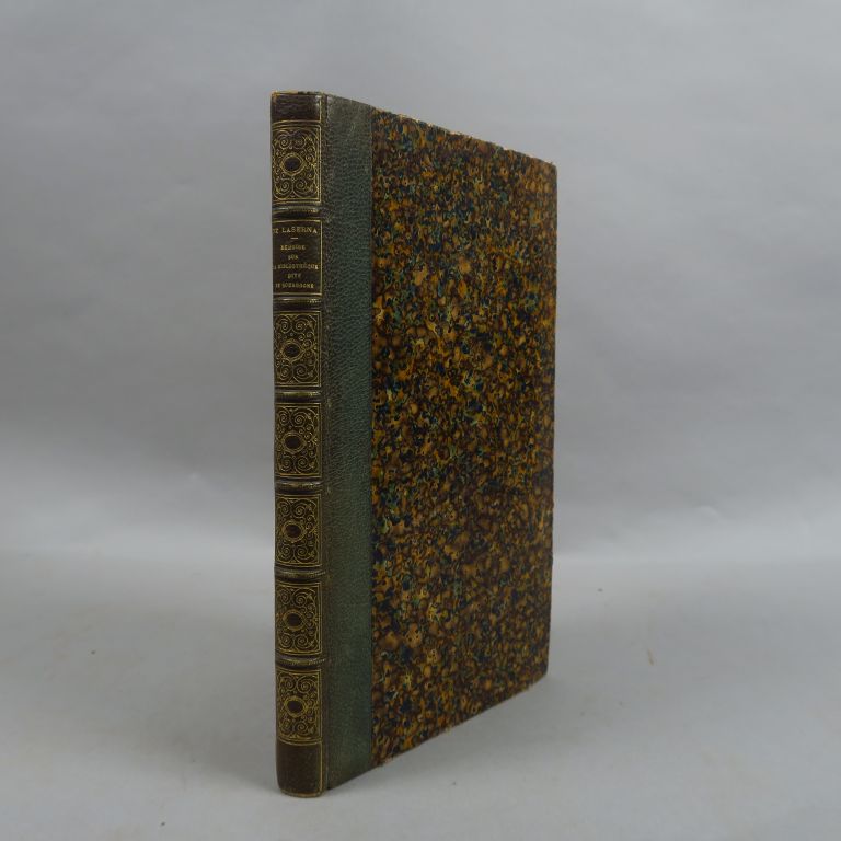LASERNA SANTANDER (M. de). Mémoire historique sur la bibliothèque dite de Bourgogne, présentement Bibliothèque Publique de Bruxelles. Bruxelles, de Braeckenier 1809. in-8. iv-216 pp. 1/2 maroquin vert, caissons dor. aux pts fers, tête dor. (Rel. postérieure). Tiré à petit nombre sur beau papier vergé, gd de marge.