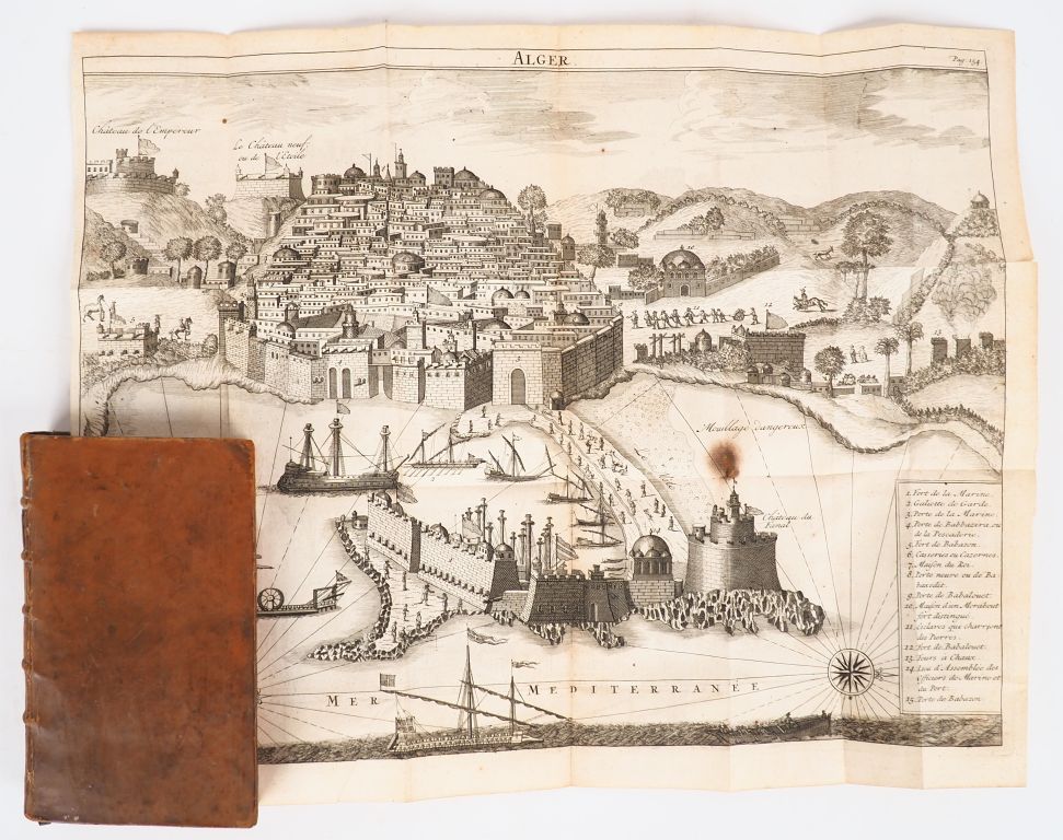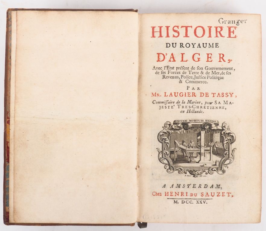 LAUGIER DE TASSY (J.-Ph.). HISTOIRE DU ROYAUME D’ALGER, avec l’Etat présent de son Gouvernement de ses Forces de Terre de Mer, de ses Revenus, Police, Justice, Politique Commerce. Amsterdam, Henri Du Sauzet, 1725. In-12 veau blond, dos à nerfs orné, pièce de titre maroquin grenat, tranches rouges (Reliure de l’époque) , (8) ff., 348 pp., (16) ff . ÉDITION ORIGINALE. Titre orné d’une vignette gravée, 2 PLANCHES gravées dépliantes. De la bibliothèque du Colonel Ph. Milon avec son ex-libris gravé. ¶ Tailliart, 1551 - Playfair, 220.