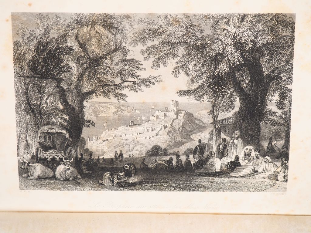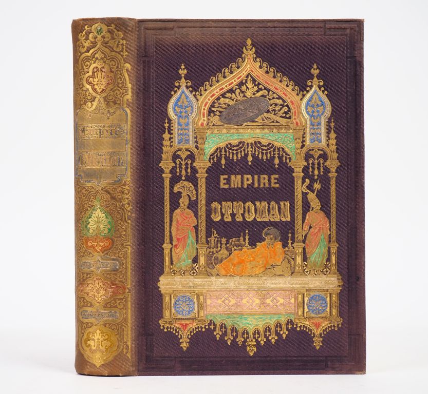 LAVALLÉE (Th.). HISTOIRE DE L’EMPIRE OTTOMAN, depuis les temps anciens jusqu’à nos jours. Paris, Garnier Frères, 1855. Grand in-8 percaline noire de l’éditeur ornée d'un décor polychrome à plaque dorée et mosaïquée, tranches dorées (Lenègre rel.). Dos passé, petite fente (2 cm) en tête du mors du 2nd plat, rousseurs, mouillure dans l’angle inférieur droit du corps d’ouvrage. ÉDITION ORIGINALE. Frontispice et 17 PLANCHES h.-t. sous serpentes gravées sur acier par Bentley et Fischer, d’après les dessins de Thomas Allom. ¶ Hage-Chahine, 2685.