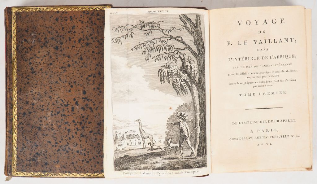 LE VAILLANT (F.). VOYAGE DE F. LE VAILLANT, dans l’intérieur de l’Afrique, par le Cap de Bonne-Espérance. P., Desray, An VI [1798]. Deux volumes in-8 basane brune granitée, encadrement de roulette dorée sur les plats, dos lisse cloisonné et orné, pièce de titre maroquin rouge (Reliure de l’époque). Accroc à la coiffe supérieure du tome I avec pertes de cuir. Ex-libris. SECONDE ÉDITION, revue, corrigée et considérablement augmentée par l’auteur. 20 PLANCHES gravées en taille-douce, dont 8 inédites. ¶ Chadenat, 1660, pour la 1ère édition de 1790 - Gay, 3118, pour la 1ère édition.