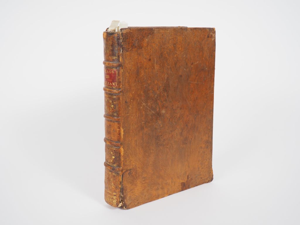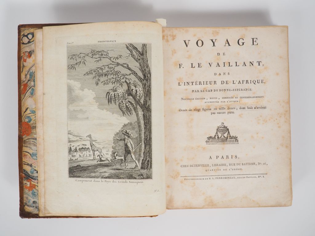 LE VAILLANT (François). VOYAGE DE F. LE VAILLANT, dans l'intérieur de l'Afrique, par le Cap de Bonne-Espérance. Paris, Deterville, [1798]. In-4 basane fauve marbrée, dos à nerfs orné, pièce de titre rouge (Reliure de l'époque). Coiffes manquantes, épidermure en tête du dos, fentes aux mors, coins émoussés, rousseurs et taches. NOUVELLE ÉDITION, au FORMAT IN-4, revue, corrigée et considérablement augmentée par l'auteur, de ce FAMEUX VOYAGE EN AFRIQUE AUSTRALE qui connût un immense succès et fut rapidement traduit dans de nombreuses langues. Elle est illustrée de 20 PLANCHES gravées en taille-douce dont 8 planches paraissent ici pour la première fois, l'édition originale de 1790 ne comprenant que 12 planches : oiseaux, girafes mâle et femelle, hommes et femmes hottentots, vues de camp et village, etc. L'ouvrage est bien complet de la planche de la Hottentote « à tablier » qui manque souvent ou est mutilée (page 425). ¶ Chadenat, 1660, pour la 1ère édition de 1790 - Gay, 3118, pour la 1ère édition.