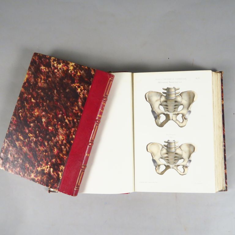 LENOIR (A. ) -SEE (Marc) - TARNIER (S.). Atlas complétementaire de tous les traités d'Accouchements. Paris, Masson 1865. 2 vol. gd in-8. 1/2 chagr. rouge, dos à 4 nerfs, caissons dor. et à froid (Rel. d'époque) Texte sur 2 colonnes et atlas de 105 planches lithographiées en couleurs d'après les dessins d'Emile Beau, montées sur onglet. Première édition