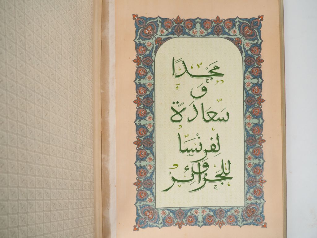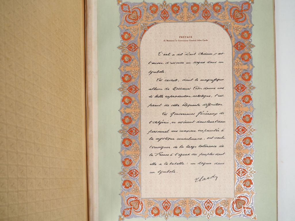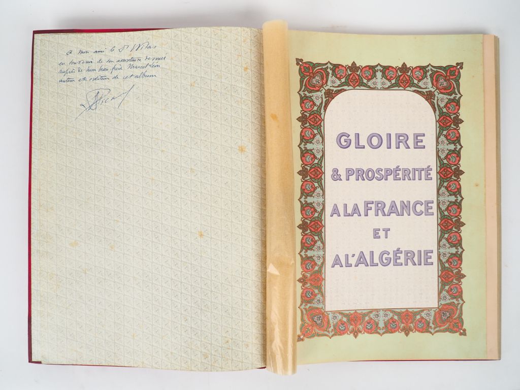 LÉON (M.). ALBUM HISTORIQUE ARTISTIQUE des sceaux officiels des gouverneurs généraux de l’Algérie depuis la conquête jusqu’en 1934. Alger, M. Léon, 1934. In-plano ½ basane rouge à coins, dos lisse muet, étui (Reliure de l’époque) , (39) ff. montés sur onglets. ÉDITION ORIGINALE de cet ouvrage TRÈS RARE. Tirage limité à 260 EXEMPLAIRES. E.A.S. au verso de la 1ère garde : « à mon ami le Dr Witas / en souvenir de son assistance dévouée auprès de mon beau-frère Marcel Léon / auteur et éditeur de cet album [signature] ». Chaque page est ornée d’un encadrement polychrome à décor orientaliste.