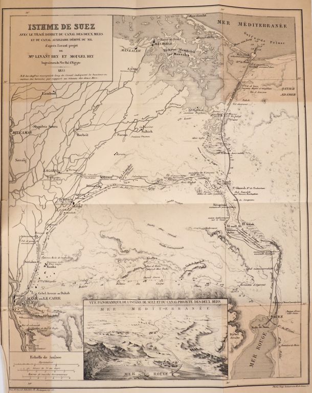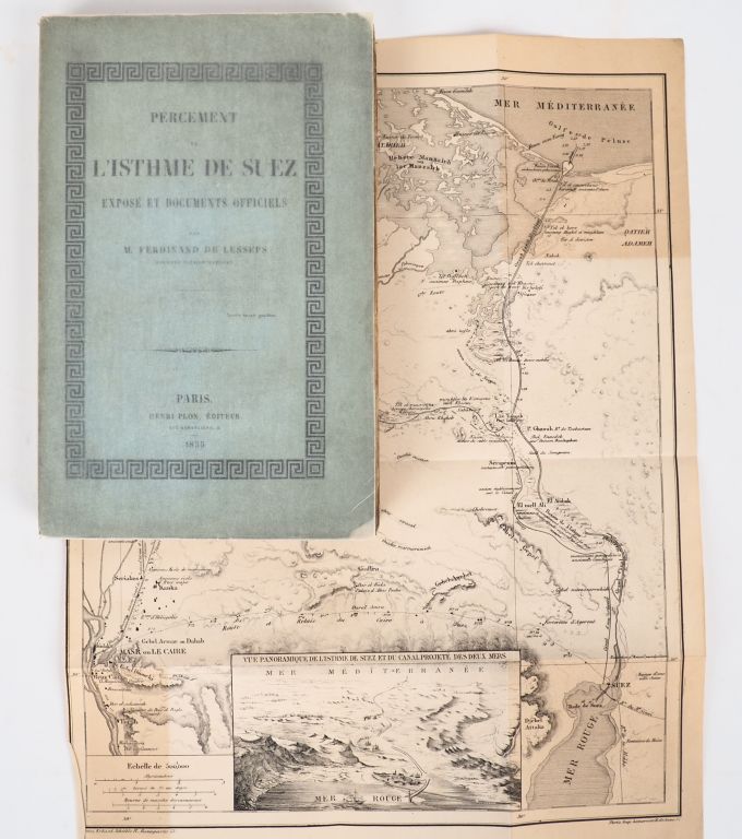 LESSEPS (F. de). PERCEMENT DE L'ISTHME DE SUEZ. Exposé et documents officiels. P., Plon, 1855. Grand in-8 broché. Rousseurs claires éparses. ÉDITION ORIGINALE. 2 CARTES lithographiées dépliantes.