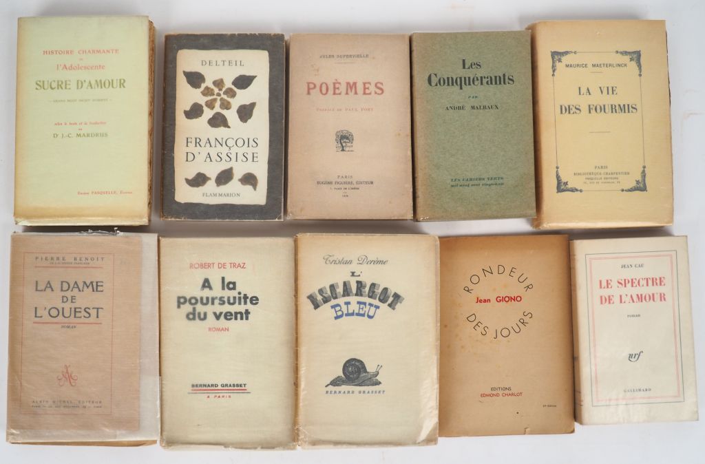 [LITTÉRATURE]. ENSEMBLE DE 10 OUVRAGES. - BENOIT (P.). LA DAME DE L’OUEST. (1936). ÉO. Un des 25 Japon. - CAU (J.). LE SPECTRE DE L’AMOUR. (1968). ÉO. E.A.S. à Jeanine et Raymond Queneau. - DELTEIL (J.). FRANÇOIS D’ASSISE. (1960). ÉO. E.A.S. - DERÈME (T.). L’ESCARGOT BLEU. (1936). ÉO. Un des 52 Rives. - GIONO (J.). RONDEUR DES JOURS. (1936). Mention de « 17e édition ». - MALRAUX (A.). LES CONQUÉRANTS. (1928). ÉO. Un des 3650 Alfa. - MARDRUS (Dr J.-C.). HISTOIRE CHARMANTE DE L’ADOLESCENTE SUCRE D’AMOUR. (1932). Un des 16 Rives. - MAETERLINCK (M.). LA VIE DES FOURMIS. (1930). Rousseurs éparses. ÉO. Un des 600 Hollande, à toutes marges. - SUPERVIELLE (J.). POÈMES. (1919). ÉO. - TRAZ (Robert de.). À LA POURSUITE DU VENT. (1932). ÉO. Un des 16 pur fil, celui-ci non numéroté.