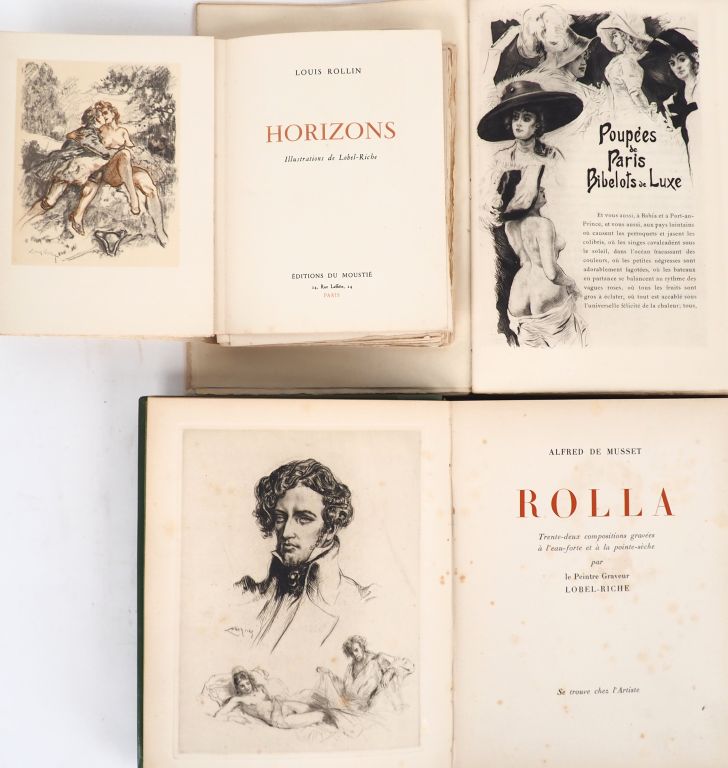 [LOBEL-RICHE]. MUSSET (A. de). ROLLA. Se trouve chez l’Artiste, 1942. In-4 ½ basane vert lierre à bandes, plats de toile chagrinée, titre doré au 1er plat, dos à nerfs orné, titre doré au dos, 1er plat de la couverture conservé. Rousseurs. ÉDITION ILLUSTRÉE de 32 COMPOSITIONS gravées à l’eau-forte et à la pointe-sèche par le peintre graveur LOBEL-RICHE. Tirage limité à 230 exemplaires. UN des 100 numérotés sur vélin d’Arches (n°225) – COQUIOT (G.). POUPÉES DE PARIS. BIBELOTS DE LUXE. P., Librairie de la Collection des Dix, Romagnol, 1912. Grand in-4 broché. ÉDITION ORIGINALE. Elle est illustrée de 40 GRAVURES originales assez lestes par LOBEL-RICHE. Tirage limité à 300 exemplaires. UN des 178 numérotés sur vélin d’Arches – ROLLIN (Louis). HORIZONS. P., Éditions du Moustié, 1945. Petit in-4 en ff., étui. Couverture brunie. ÉDITION ILLUSTRÉE de compositions érotiques de LOBEL-RICHE : frontispice à l’eau-forte, 16 h.-t. en 1 ou 2 tons, 25 en-têtes et culs-de-lampe. Tirage unique limité à 950 exemplaires numérotés sur vélin Lana pur chiffon à la forme. ENSEMBLE DE 3 OUVRAGES.
