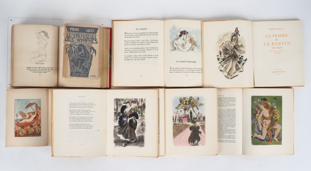 LOUŸS (P.). ŒUVRES CHOISIES. P., Albin Michel, 1948. 5 vol. in-4 brochés sous chemise et étui cartonnés de l’éditeur (fente à l’étui). ÉDITION ILLUSTRÉE en couleurs. Tirage limité à 1730 exemplaires. UN des 1500 numérotés sur vélin. APHRODITE. Ill. par J. A. CANTE – LES CHANSONS DE BILITIS. Ill. par Louis ICART – LA FEMME ET LE PANTIN. Ill. par J. TRAYNIER – LES AVENTURES DU ROI PAUSOLE. Ill. par BEUVILLE – POËMES. Ill. par BERTHOMMÉ SAINT-ANDRÉ – LES CHANSONS SECRÈTES DE BILITIS. P., Kra, 1930. Grand in-4 en ff., chemise et étui. ÉDITION ILLUSTRÉE de 12 GRAVURES h.-t. en couleurs de KUHN-RÉGNIER. Tirage limité à 3300 exemplaires numérotés sur vélin du Marais – LE CRÉPUSCULE DES NYMPHES. Montaigne, 1926. In-12 broché. ÉDITION ILLUSTRÉE de 5 BOIS originaux dessinés et gravés par Jean SAINT-PAUL – LES CHANSONS DE BILITIS. P., Union Latine d’Éditions, 1934. Petit in-4 ½ chagrin rouge à coins, dos à large nerf unique contenant la pièce de titre chagrin noir (Reliure de l’époque). ÉDITION ILLUSTRÉE de DESSINS érotiques à pleine-page et dans le texte de Mariette LYDIS. Tirage limité à 5160 exemplaires numérotés sur vélin chiffon. ENSEMBLE DE 8 OUVRAGES.