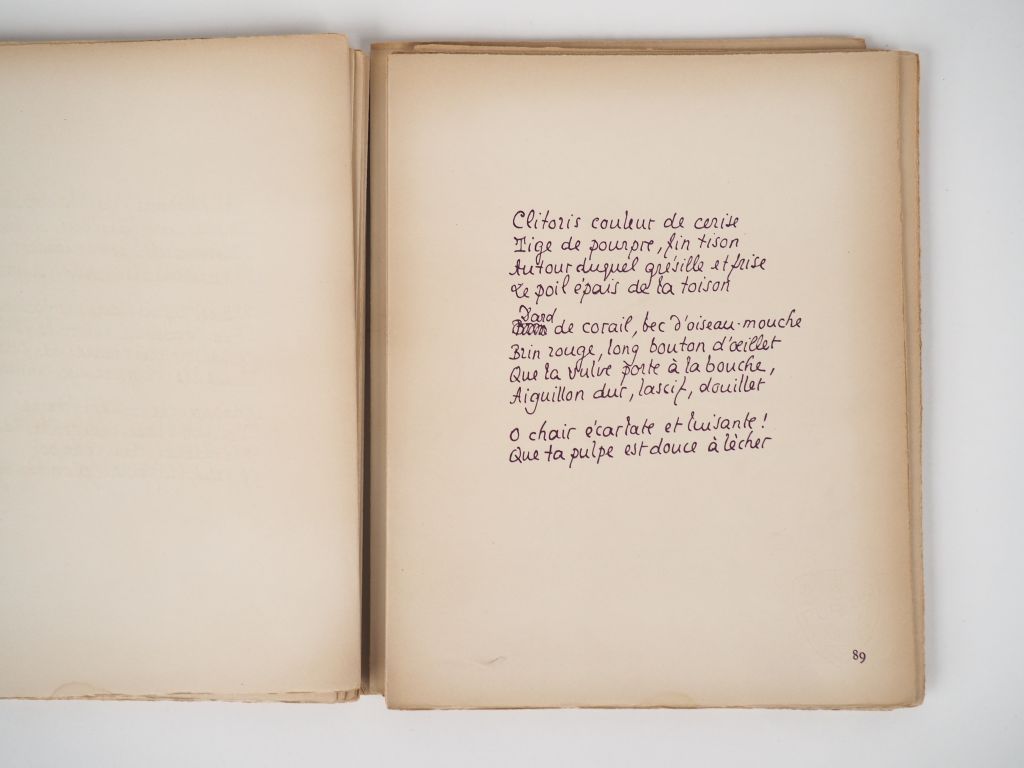 LOUŸS (P.). POÈMES ÉROTIQUES INÉDITS. Préface de G. H. Paris [Nice, André Bottin], 1945. Grand in-4 en ff. ÉDITION ORIGINALE ornée de 12 LITHOGRAPHIES libres h.-t. et d’un dessin sur la couverture de P. BELOTI. Texte manuscrit reproduit en fac-similé en violet. Tirage limité à 190 exemplaires. UN des 150 numérotés sur vélin du Marais. ¶ Dutel, 2222 – Pia, 1445.