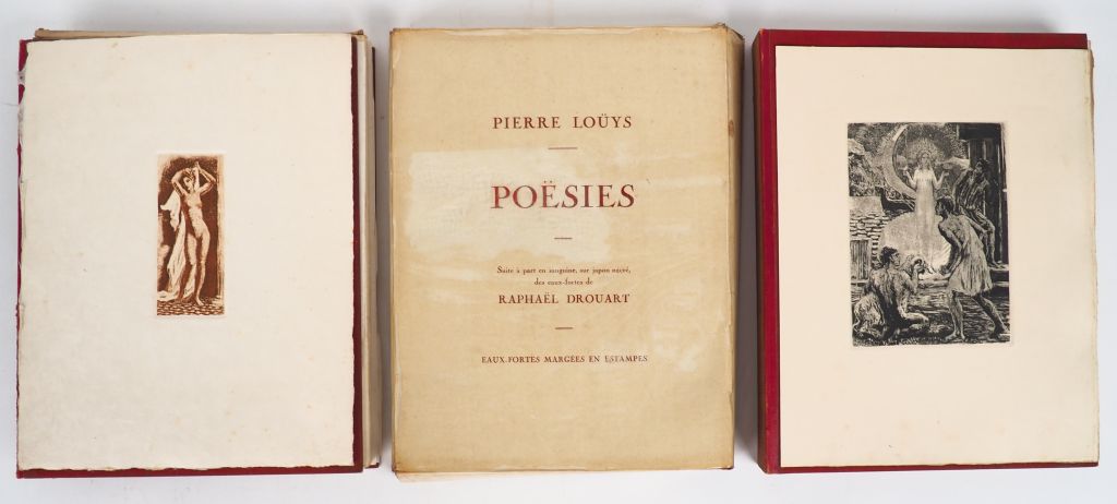 LOUŸS (P.). POËSIES. P., Crès, 1930. Trois volumes en ff. sous chemises et étui commun. Quelques rares rousseurs claires très éparses. ÉDITION ILLUSTRÉE de 70 EAUX-FORTES de Raphaël DROUART, dont 7 h.-t. Tirage limité à 110 EXEMPLAIRES. UN des 10 numérotés du tirage de tête sur vieux JAPON à la forme, celui-ci le NUMÉRO 1 comprenant DEUX SUITES à part des eaux-fortes margées en estampes, l’une en noir sur Chine et l’autre en sanguine sur Japon nacré, contenant chacune 7 eaux-fortes supplémentaires. JOINT le spécimen de l’ouvrage sur feuillet double.