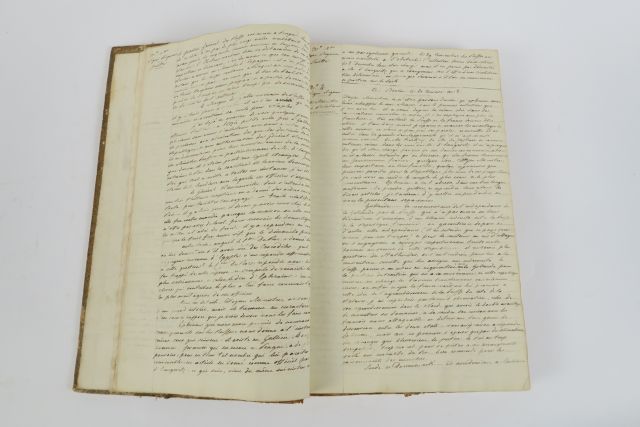 MANUSCRIT. Correspondance diplomatique d'un représentant du Directoire à la cour de Berlin, adressée au Ministre des Relations Extérieures. 150 lettres, numérotées 107 et 43, datées du 16 frimaire An VIII au 27 pluviose An X (10 décembre 1799 - 16 février 1802). Copie d'époque reliée en 1 volume in-folio. 1/2 basane (Rel. d'époque). Reliure frottée.