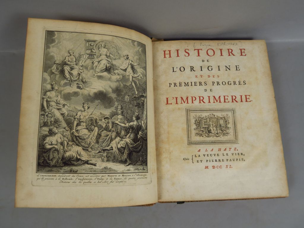 [MARCHAND, Prosper]. Histoire de l’origine et des progrès de l’Imprimerie. La Haye, Le Vier et Paupie 1740. in-4, XII-152 pp. Veau marbré, dos lisse orné (Rel. de l’époque). Beau frontispice allégorique. Fente aux mors, us. à 2 coins.
