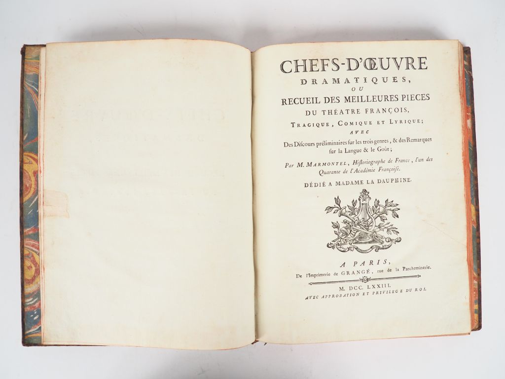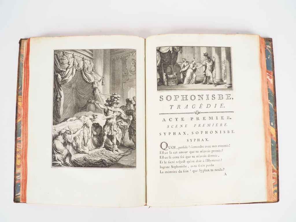 MARMONTEL. Chefs-d'œuvre dramatiques ou Recueil des meilleures pièces du Théâtre français, tragique, comique et lyrique , avec des discours préliminaires sur les trois genres et des remarques sur la langue et le goût. Dédié à Madame La Dauphine. Paris, Impr. De grangé 1773. in-4, LXXII-107pp. Veau écaille, fil. dor. en encadr. dos orné (Rel. de l'époque) Première partie seule contenant "La Sophoniste" de Mairet. Frontispice et bandeau d'Eisen. "Première tragédie qui fût digne d'être connue", donnée en 1633