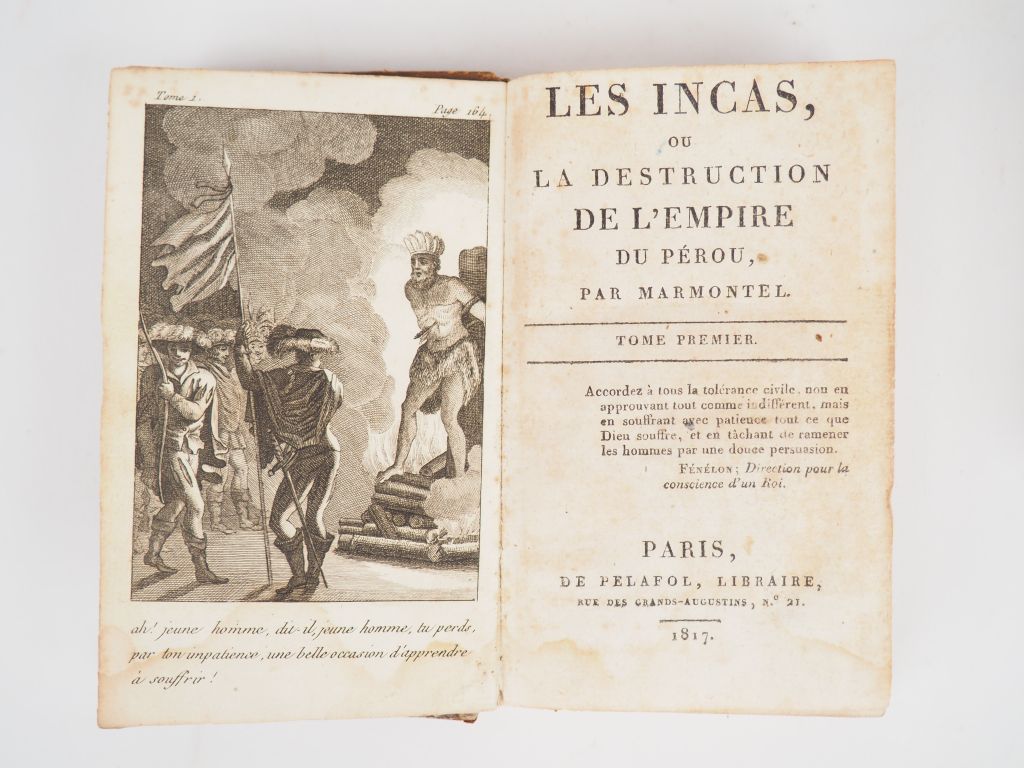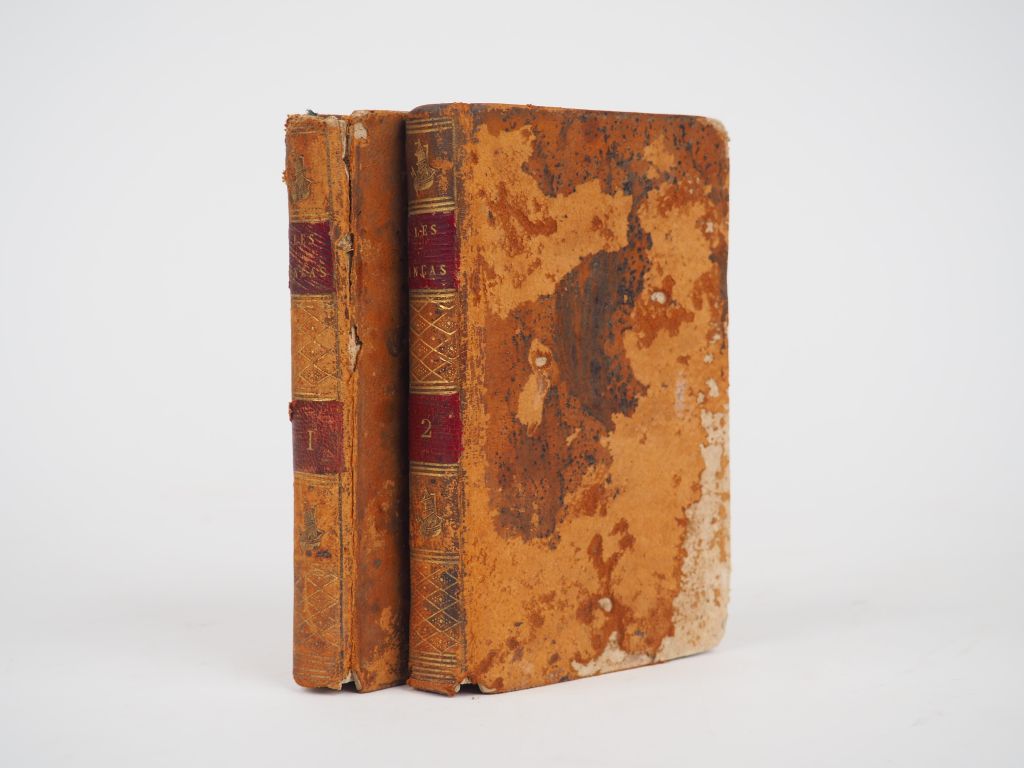 MARMONTEL. Les Incas ou la destruction de l'Empire du Pérou. Paris, de Pelafol 1817. 2 vol. pt. in-12, basane, dos lisse orné, pce de titre (Rel. de l'époque). Plats frottés, manques de peau.