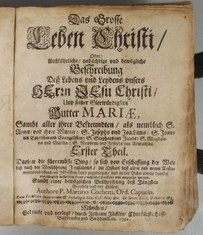 MARTINO VON COCHEM (R. P., Capuciner Ordens). Das Grosse Leben Christi. Beichreibung dess lebens und lendens unsers Herin Jesu Christi und seiner Mutter Mariae. Reliure d'époque peau de truc estampée à froid sur ais de bois, fermoir. Vie du Christ par un Révérend Père Capucin. Figures en taille-douce hors-texte. Volume premier, seul.